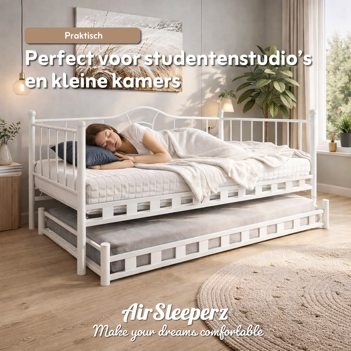 Op zoek naar een praktische slaapbank die perfect past in een kleine ruimte? De AirSleeperz® metalen slaapbank Lisa is de ideale oplossing voor wie slim wil omgaan met ruimte, zonder in te leveren op stijl en stevigheid. Deze moderne bedbank combineert een strak design met een robuuste constructie en is ideaal als eenpersoonsbed, logeerbed of slaapbank voor studenten.